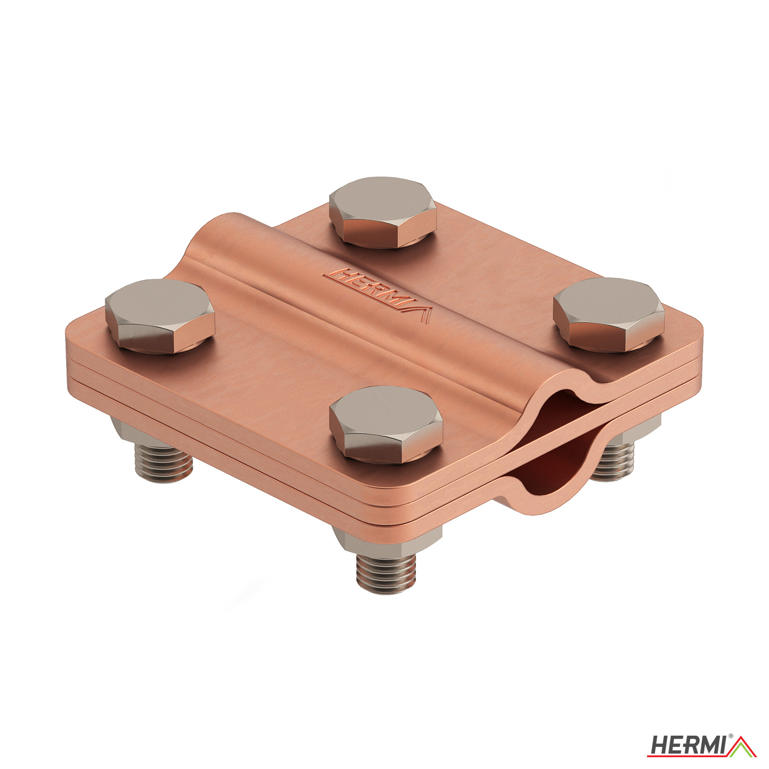 KON08 sponka | KON08 sponka, sestavljena iz 3 ploščic dimenzij 48 mm x 48 mm in vijakov ter matic M6, namenjena izvedbi kontaktnih spojev med okroglimi vodniki različnih dimenzij v zemlji in nad njo. | Vodnik 1: Ø = 8 mm