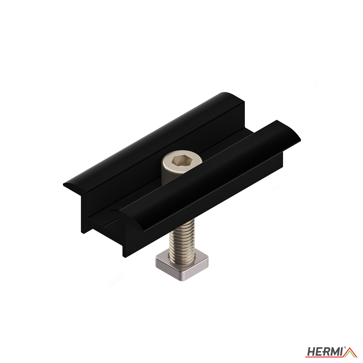 Vmesna sponka s kvadratno matico za namestitev FN modula na nosilne konstrukcijske profile Hermi. Na voljo v sivi in v črni barvi. |