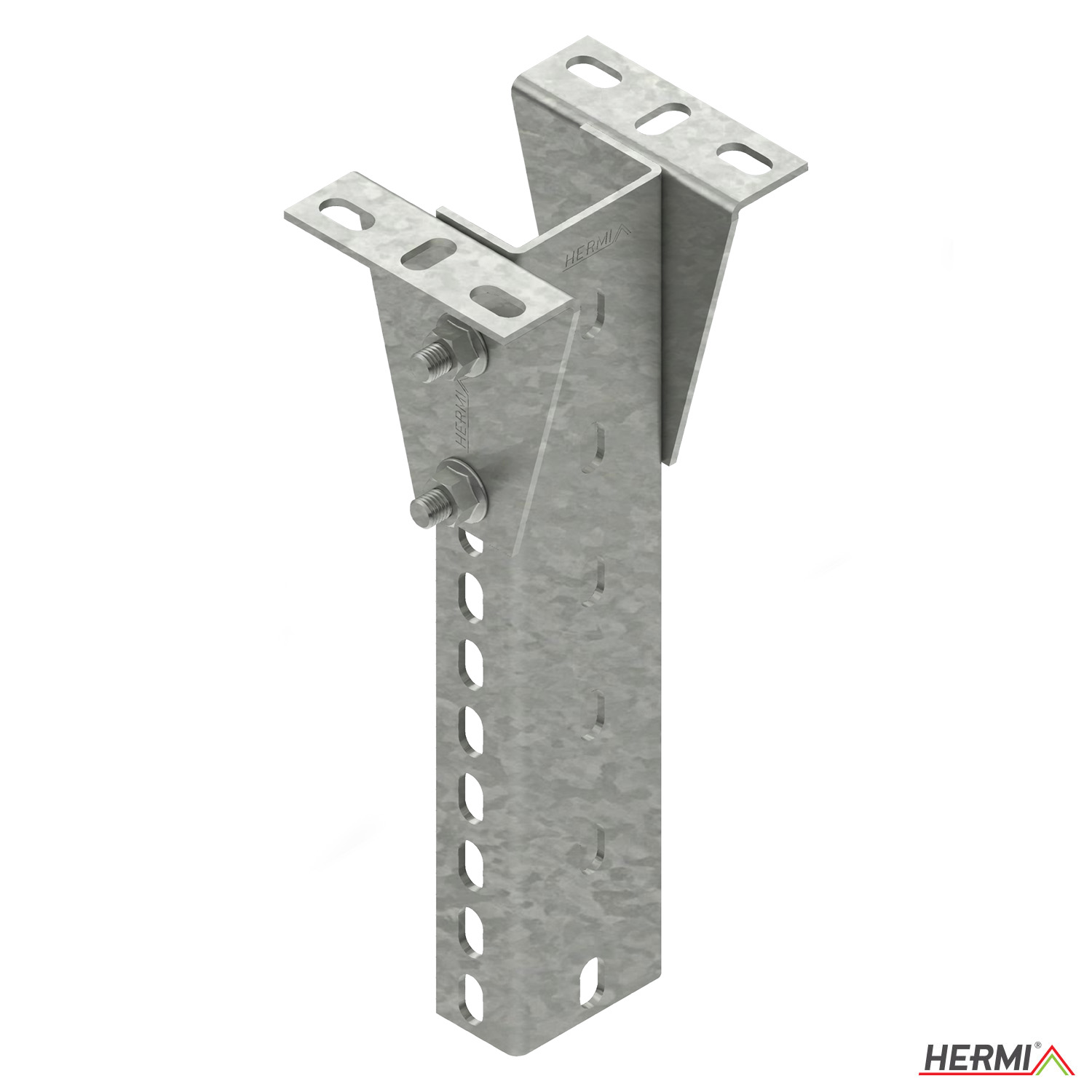 NKP-SNU/P 300 viseči nosilec FeZn-H | Viseči nosilec za montažo kabelskih polic na strop. Možnost prilagajanja ravnini stropa. Nosilec se na strop pritrdi s štirimi vijaki. Na nosilec se pritrdi stenski nosilec (NKP-SNT, NKP-SNTD) kot nosilni element kabelske police in kabelske lestve. | Dolžina: 65 mm